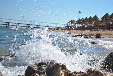 Sea wave beats against the shore with spray. In the background is a beach, a pier forbidding swimming a red flag