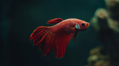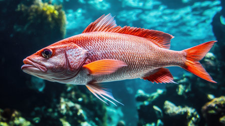 A stunning close-up of a red fish gracefully swimming underwater, highlighting its intricate features and vibrant colors against a serene ocean backdrop.