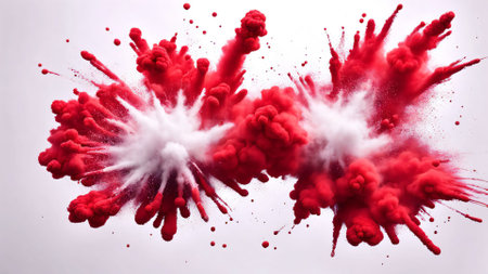 Witness the captivating explosion of red powder, creating a dynamic, abstract scene filled with energy and vivid colors, perfect for various artistic applications.