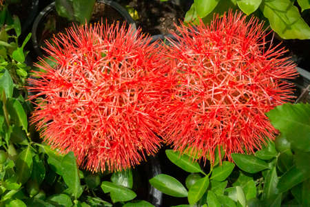 bright red Ixora coccinea flowers, also known as Scarlet Jungle Geranium or Flame of the Woods. Clusters of small, star-shaped blooms stand out against the lush green foliage. This image captures the intensity and beauty of these tropical flowers.