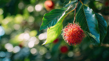 A sunlit portrait of a single Rambutan, photographed outdoors on a clear, breezy day. Fresh, crisp air renders vivid detail in the leave veins glowing with gentle backlight. The background falls into a soft natural bokeh of greenery, colors true-to-life, organic beauty in pure sunlight.