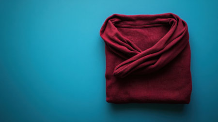 This image features a neatly folded burgundy sweater against a vibrant blue background. The cozy textile evokes warmth and stylish comfort, suitable for various fashion displays.