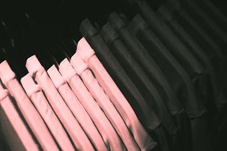 Row of black and pink T-shirts on black hangers, a top - down view, a closeup.