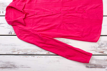 Female red shirt on wooden background. Women classic long sleeve blouse on white wooden table, top view.