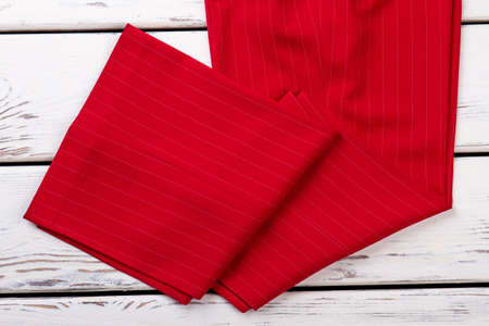 Fashion red pants on white wooden background. Fill lenght creases trousers.