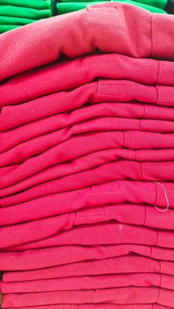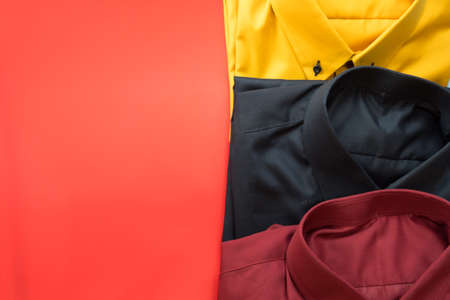 Folded male fashion shirts for adult collection on red background. Copy space for text.