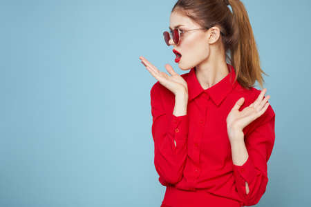 Woman in red shirt on blue background holds hands near face and sunglasses red lips makeup model