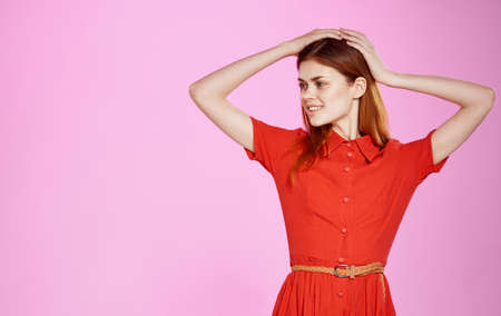 Charming woman in a red dress on a pink background gestures with her hands Copy Space