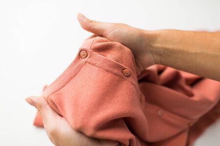 close up of hands with clothing item or cardigan
