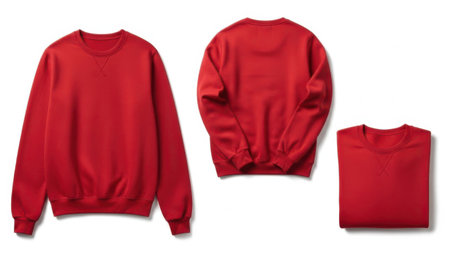 The image displays three red sweatshirts shown from various angles. The sweatshirts are laid out on a white background. One sweatshirt is shown from the front, another from the back, and the third is folded neatly. The sweatshirts have a classic design with crew necks and long sleeves.