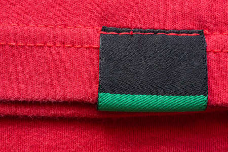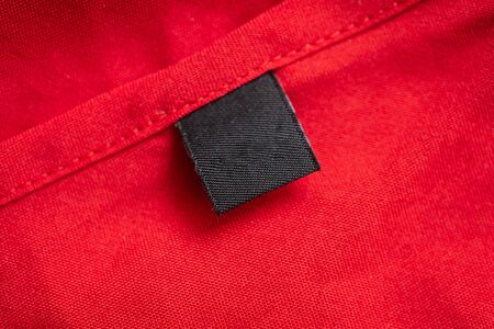Black blank laundry care clothes label on red cotton shirt background