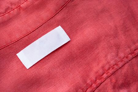 White blank clothing tag label on red linen shirt fabric texture background
