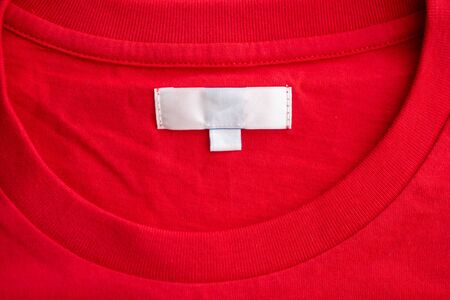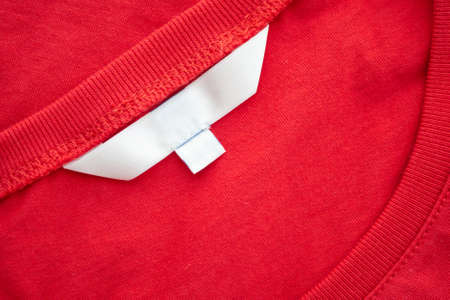 White blank clothing tag label on new red cotton shirt fabric texture background