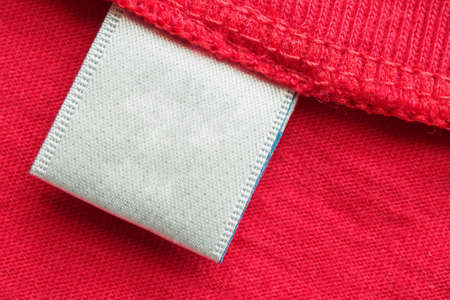 White blank laundry care clothes label on red cotton shirt background