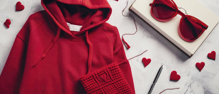 Top View red Sweater and Hoodie Mock-up Unisex Fashion, Book, Sunglasses