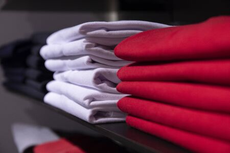 Red and white men clothing on shelf. T-shirt on rack for sale in shop. Autumn seasonal wear in department store. Unisex apparel for cold weather. Sale in shopping mall. Classic color top garment
