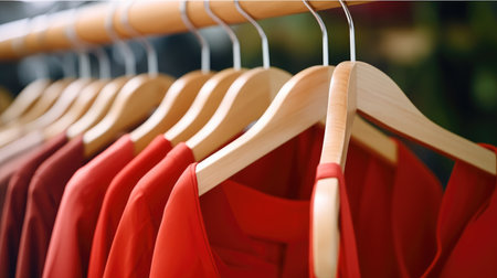 Red T-shirts on hangers on a shop wardrobe closet rail