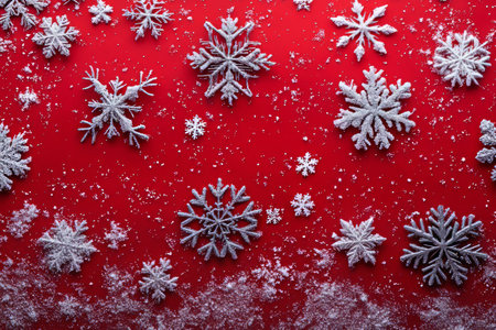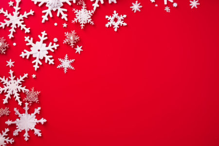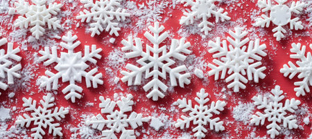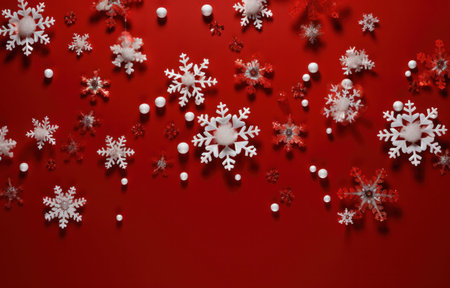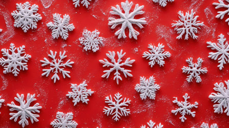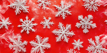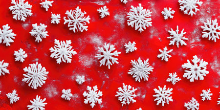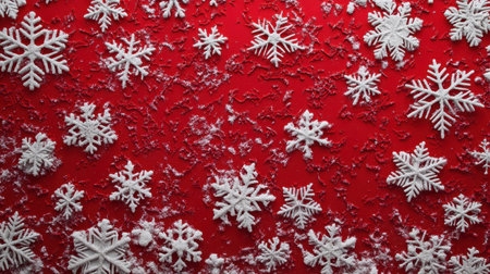 Delicate white snowflakes are artistically arranged on a bright red surface, creating a cheerful winter decorative scene perfect for the holidays.