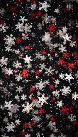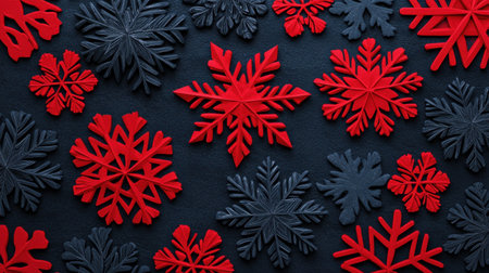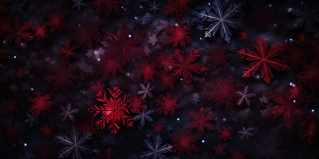 A black and red background with a variety of snowflakes in different sizes and shapes. The snowflakes are predominantly red and black, creating a striking contrast against the dark background