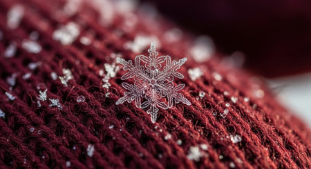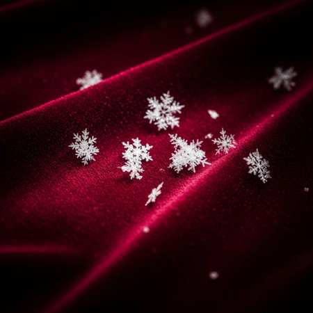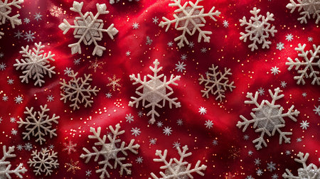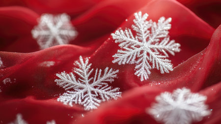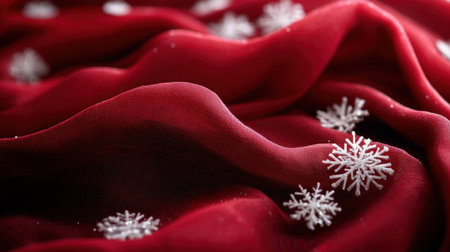 A beautiful close-up of rich red fabric adorned with delicate white snowflakes, perfect for evoking a festive winter atmosphere in holiday designs.