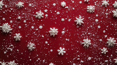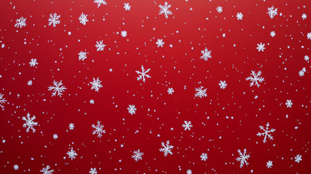 A vibrant red background adorned with delicate white snowflakes creates a cheerful and festive atmosphere, ideal for holiday-themed designs.
