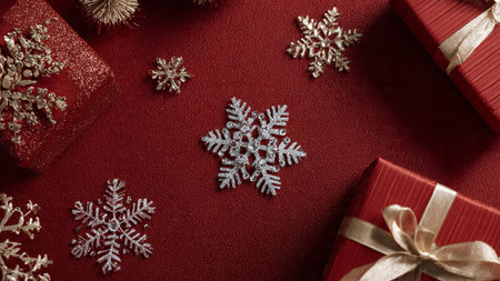 Sparkling gold and silver snowflakes float serenely on a deep red canvas, celebrating the luxurious spirit of the festive season.
