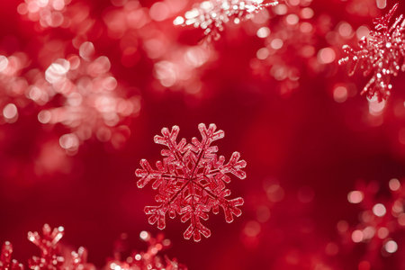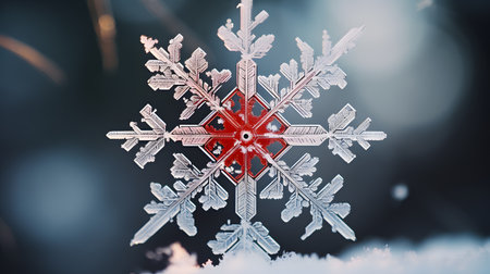 Glittering Red Snowflake on Sparkling Snow Surface with Soft Bokeh Background, Perfect for Holiday and Winter Themes