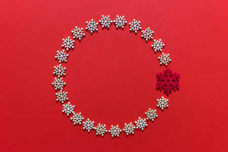 White snowflakes on red background. Christmas background. Flat lay, top view.