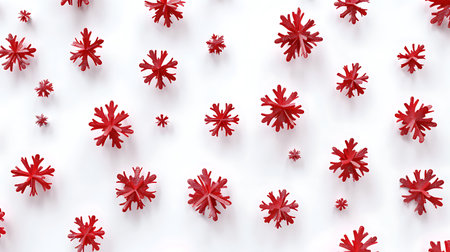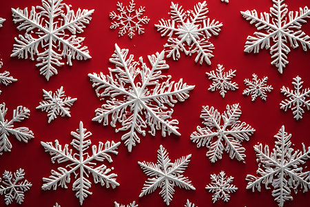 A vibrant arrangement of white snowflakes scattered on a red background, perfect for winter celebrations. Ideal for holiday-themed designs and promotions.