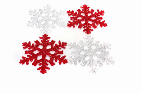 Red snowflakes isolated on white background. Christmas concept. Flat lay, top view.
