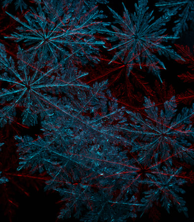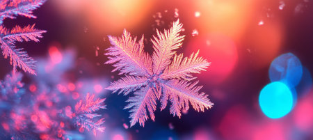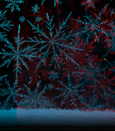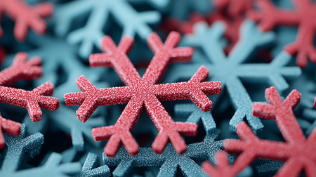 A close-up of vibrant red and blue snowflakes set against a soft focus background, evoking winter's magic. The atmosphere feels festive and whimsical.