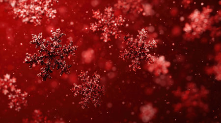 Delicate snowflakes glisten and swirl in the air over a bright red backdrop, evoking the spirit of winter festivities and celebrations during the holiday season.
