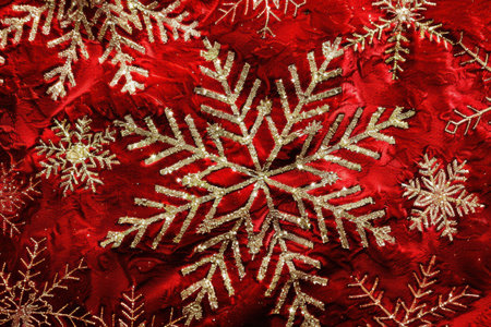 Beautiful golden snowflakes gracefully rest on a deep red background, creating a festive atmosphere with a soft sparkling bokeh effect, perfect for holiday designs.