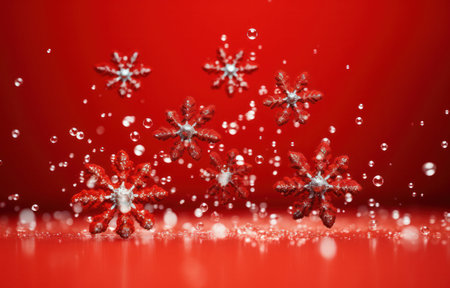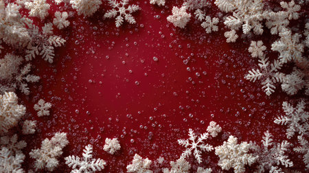 This captivating image features a rich red background adorned with delicate white snowflakes and sparkling bubbles, evoking a festive winter atmosphere perfect for holiday-themed projects.
