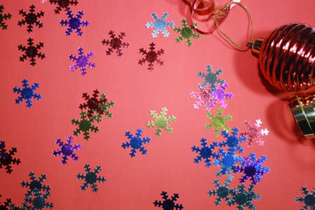 Christmas decoration with snowflakes on a red background. Shallow depth of field