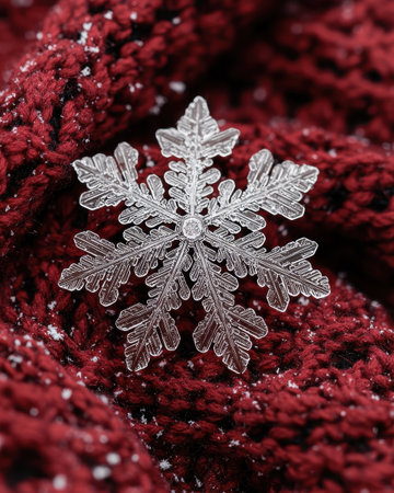 A delicate snowflake showcasing its intricate beauty on a vibrant red feather surface