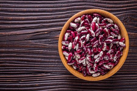 Violet with dots beans in wooden plate. Swallow beans. Vegetables for healthy eating. Organic food. Diet