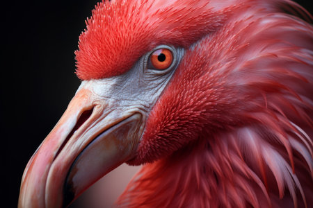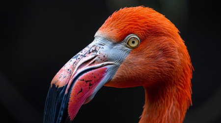 Close up of a vibrant orange flamingo against a dark background, showcasing its unique features and vibrant colors