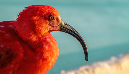 Detailed head shot of a vivid scarlet ibis bird its bright red feathers contrast with pale head and long curved black beak bird is looking to side showing its sharp eye wildlife portraiture