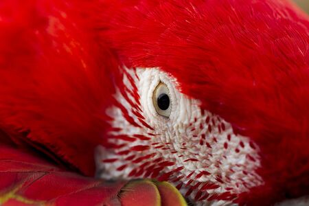 A selective focus shot of a beautiful red parrot with yellow and blue marks