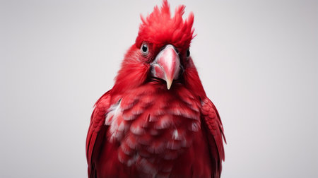a red parrot perches on a white background in this contemporary realist portrait photograph. the inventive character design showcases sharp, prickly features, creating a monochromatic masterpiece. rendered in unreal engine, this national geographic photo captures the explosive pigmentation of the parrot's vibrant red feathers. ai generated