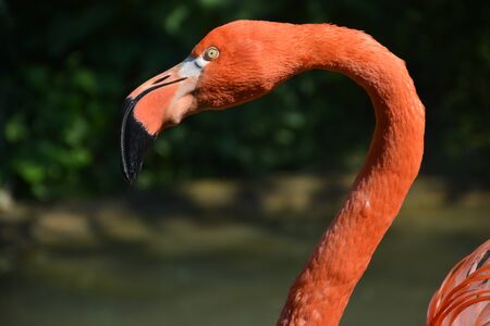 Close-up portrait of a flamingo in the background of leafy trees. (Phoenicopterus ruber)
