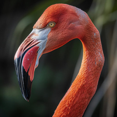Close up profile of a vibrant orange flamingo against a dark background, showcasing its striking features and elegant beak