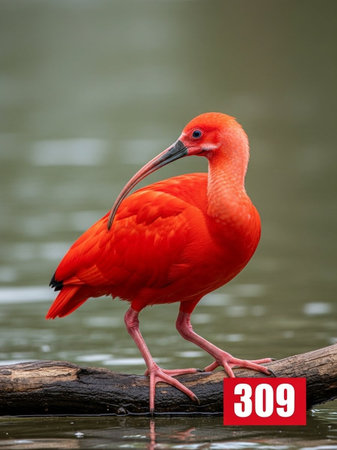 A striking scarlet ibis bird is captured in a close-up shot, showcasing its brilliant red plumage and long, curved beak.