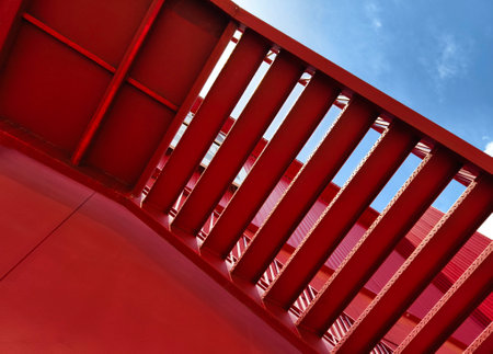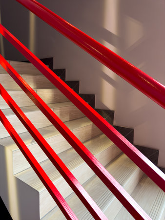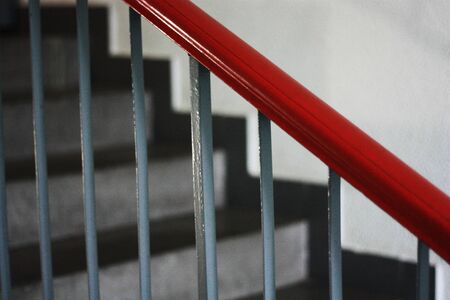 A red railing on a staircase. The railing is painted in a way that it looks like it is made up of many thin strips