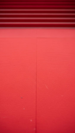 Close up red carpet over grey concrete stairs perspective ascending, low angle view