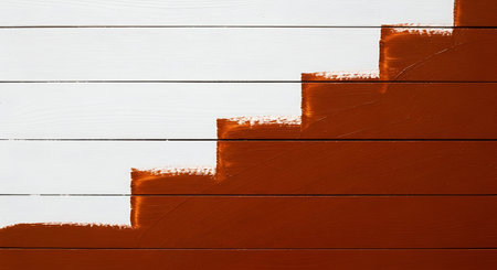 A close-up view of horizontal white wooden planks where a section is being painted with rich brown paint. The paint application creates a stepped or stair-like pattern, with visible brush strokes and texture. The contrast between the white and brown areas highlights the process of painting and transformation.