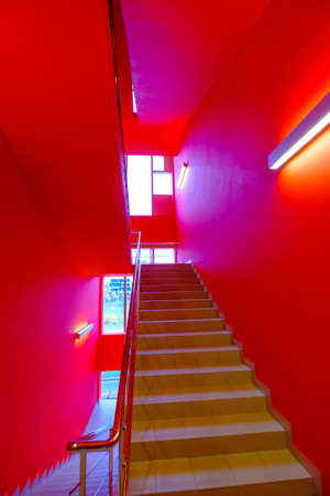 Red-yellow modern staircase with a handrail in a building without an elevator