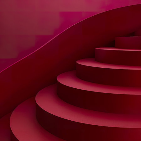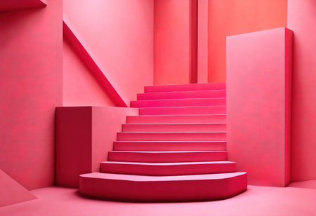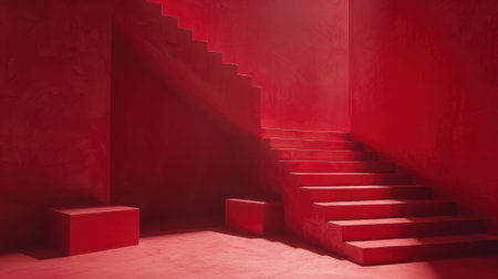 3d vector room with stairs, red wall background. Minimal geometric realistic pedestal with staircase for product. Perspective view layout with platform, light from window. Minimalist presentation