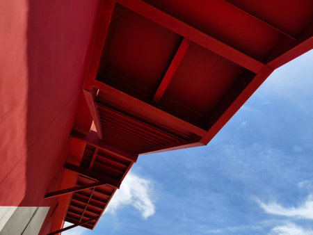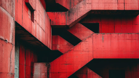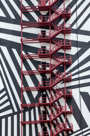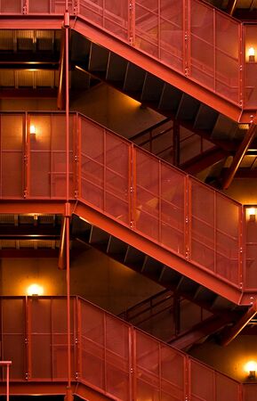 modern building is burgundy yellow with an emergency exit fire metal staircase on the facade. Conceptual background.
